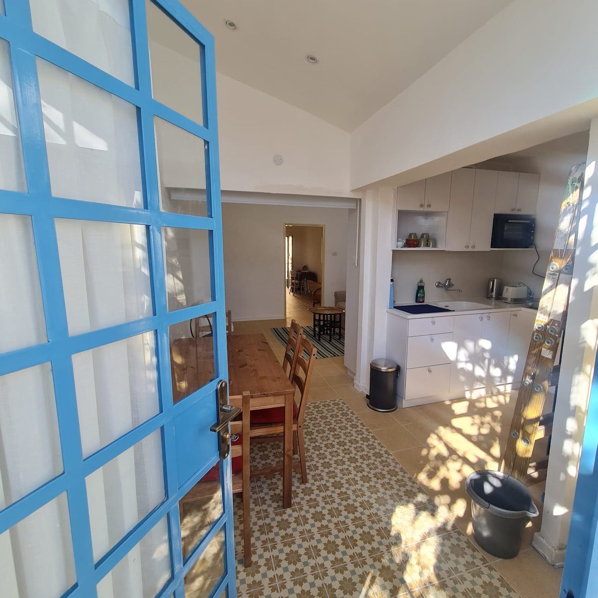 Апартаментът се намира в типична 100 - годишна каменна сграда. Той има очарованието на древността с високия си таван, но е напълно реновиран, изпълнен със светлина и много тих, въпреки че е близо до оживения пазар на открито Махане Йехуда. Той е централно разположен, близо до обществения транспорт, автогарата и трамвайната линия на улица „Яфо “, водеща до Стария град, и на 10 минути пеша от жп гарата до Тел Авив. Идеален за семейство или за двойка, с две хубави малки тераси.