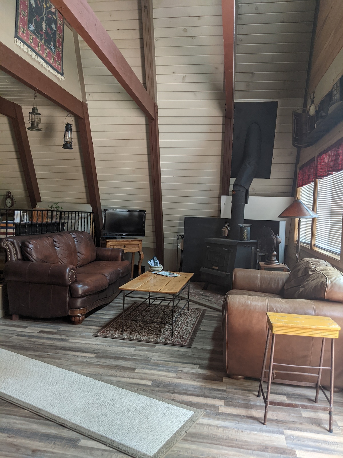 Само на една пресечка от Hwy 4, на пешеходно разстояние от магазини и заведения за хранене. Една спалня с едно двойно легло и голямо таванско помещение (нагоре по спиралното стълбище) с едно двойно легло. Осигурени са чаршафи и кърпи. Хубава палуба за вечеря навън. Подходящо за кучета! (Дворът не е ограден). Забележка: в хола има малък климатик. Това е хижа в планината, така че няма да бъде толкова топла, колкото у дома. ЗАБЕЛЕЖКА: Verizon работи, AT&T има малко или никакво приемане в този район.