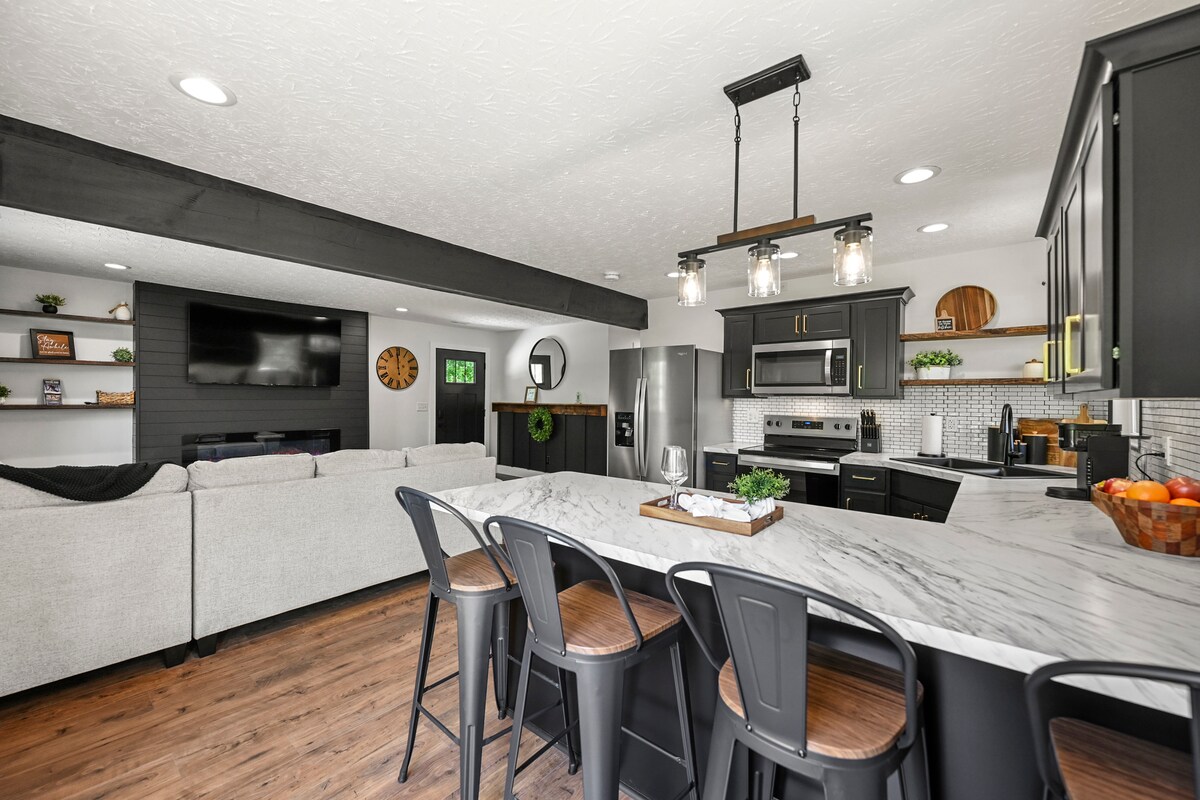 СВОБОДНО ЗА ДИПЛОМИРАНЕТО В МАЯМИ ПРЕЗ 2026 Г.! Скривалището на Backwoods осигурява идеалното бягство за семейство или просто двойка, която иска да избяга! Намира се на 75 - акрова ферма между Синсинати и Дейтън и само на 8 мили от Оксфорд! Може да се похвали с впечатляващ отворен план на етажа и просторен открит вътрешен двор с изглед към гората! Отпуснете се в луксозната стая с 3 легла, с лофт и 2 пълни легла за децата и ваканционна къща с 2 бани с най - невероятните гледки към залеза!! Гостите ще имат достъп до целия дом!