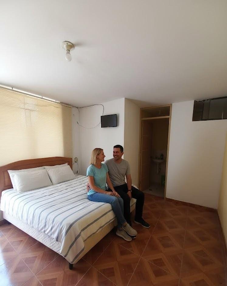 Descubre nuestra acogedora habitación matrimonial en Camaná Con baño privado y un ambiente tranquilo, es perfecta para parejas. Disfruta de la piscina al aire libre y el patio de juegos para una estancia relajante y divertida.