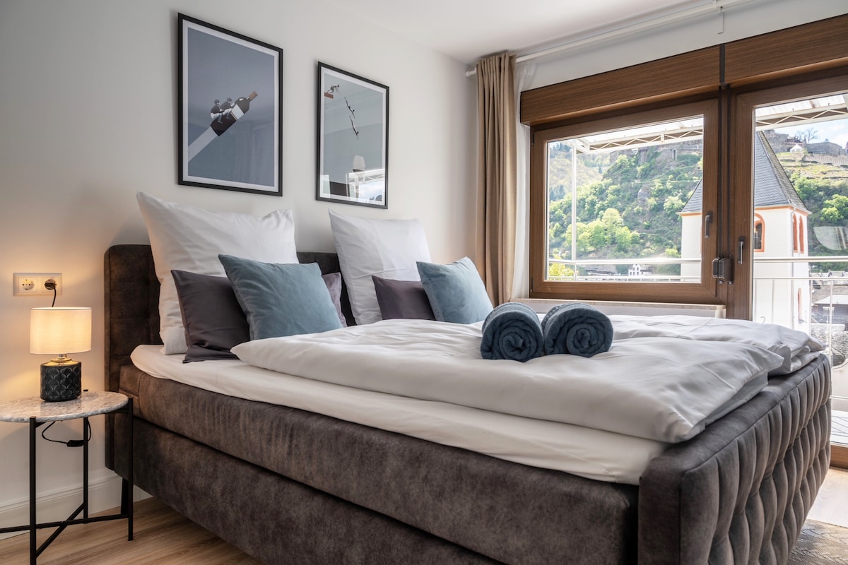 Насладете се на Кохем в първокласен апартамент с неповторима гледка към Мозел и замъка! Изживейте мечтан престой в този достъпен апартамент с 2 спални: → 180 см КРАЛСКИ РАЗМЕРИ ПРУЖИНА → 160 см ДВОЙНО ЛЕГЛО QUEEN SIZE ПРОЛЕТНО ЛЕГЛО → Смарт телевизор с NETFLIX и waipu tv Кафе → NESPRESSO за перфектна сутрин → Напълно оборудван кухненски бокс → Балкон, който извежда Мозел и замъка до върха на пръстите → Само на 5 -10 минути пеша от центъра на Кохем и се намира директно на Мозел.