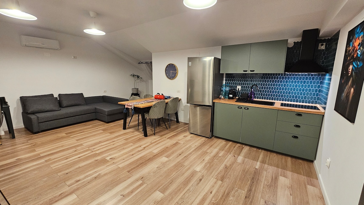 Our cozy & modern 2-rooms apart. is located in the peaceful Hanul Doctorului - Panoramic area. Perfectly furnished and fully equipped, it features a central heating system, AC, TV, free WiFi, double bed and an extendable sofa to ensure a comfortable stay. The flat is very close to the airport and offers excellent access to local attractions. It's just 5 min from Electroputere Mall, 10min to the city center (Xmas Market), 10 min to Parcul Romanescu (Easter Fair), less than 500m from a bus stop.