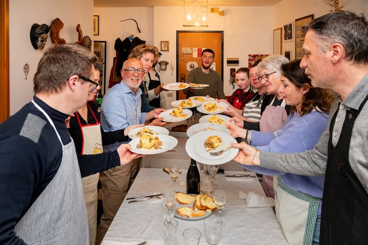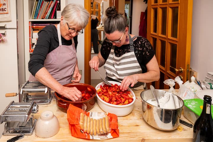 Снощи хапнахме чудесно с Франческо. Той е много добре осведомен и страстен за храната, която сготвихме, и беше щастлив да ми предаде знанията си. Имахме пълно тристепенно хранене, от което допринесох за всеки курс. Сложно предястие от пикантни броколи и аншоа флан с крем от бутернут. Класическа талиатели „слама и сено “, която е смес от жълта и зелена паста, приготвена от нулата, заедно с класически сос рагу. За да завършим, имахме тенджера с плодове в стил тирамису с бадеми и сметана.