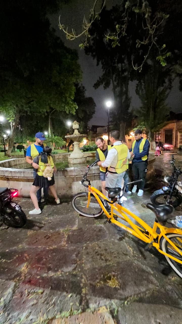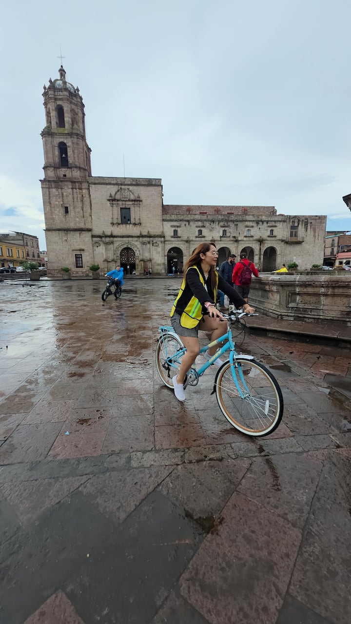 Имаше двама водачи — единият водеше групата, а другият остана в задната част и блокираше движението, когато беше необходимо. Посетихме няколко красиви църкви, паркове и търговски зони – приятен преглед на Морелия.