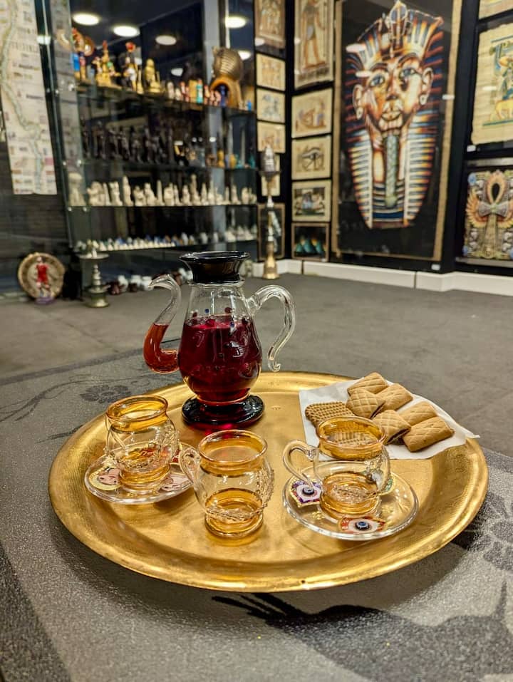 Открийте ароматите и лечебните ползи от древноегипетските масла и парфюми, докато се наслаждавате на традиционното египетско гостоприемство с чай или кафе и бисквити.