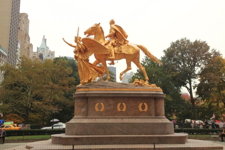 We meet at the gold statue of General William T. Sherman on a horse, located on 5th Ave between 59th and 60th St, Manhattan.