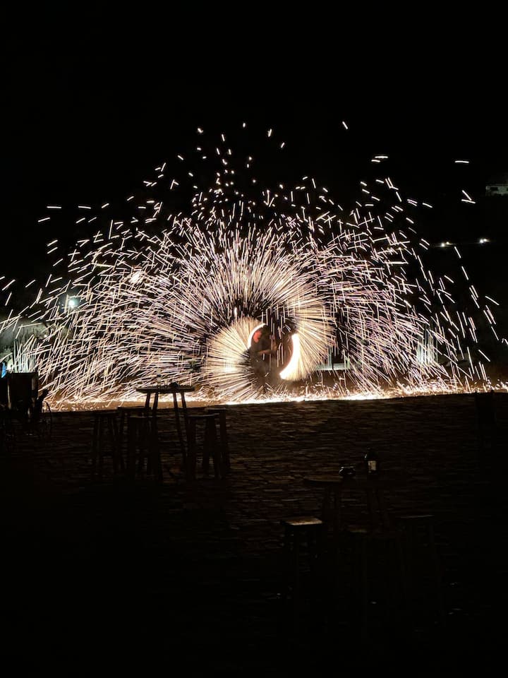 Насладете се на зашеметяващо огнено шоу в пустинята с музика, движение и светлини – вълнуващ културен момент за заснемане.