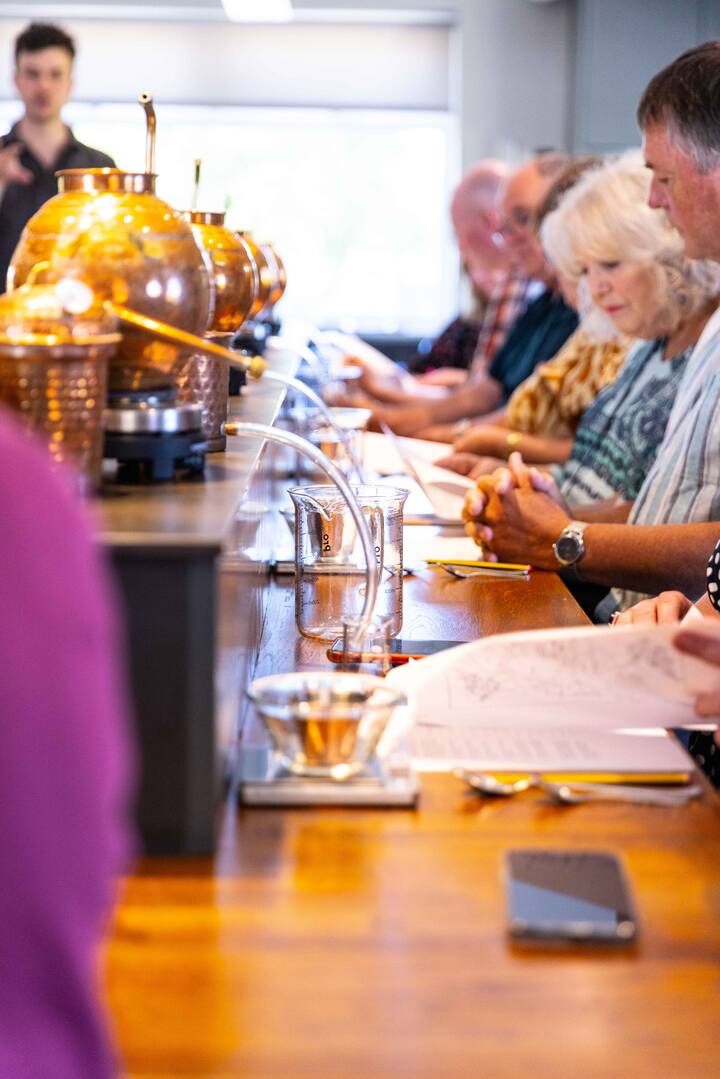Пригответе джин в миниатюрна медна дестилационна апаратура, докато се наслаждавате на дегустации и напитки.