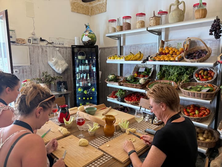 В историческия магазин за плодове и зеленчуци на семейството ми ще ви покажа как да приготвите свежа пулийска паста, като използвате продукти от нашата ферма. Замесвайте, опитвайте и изживейте истинската домашна кухня.