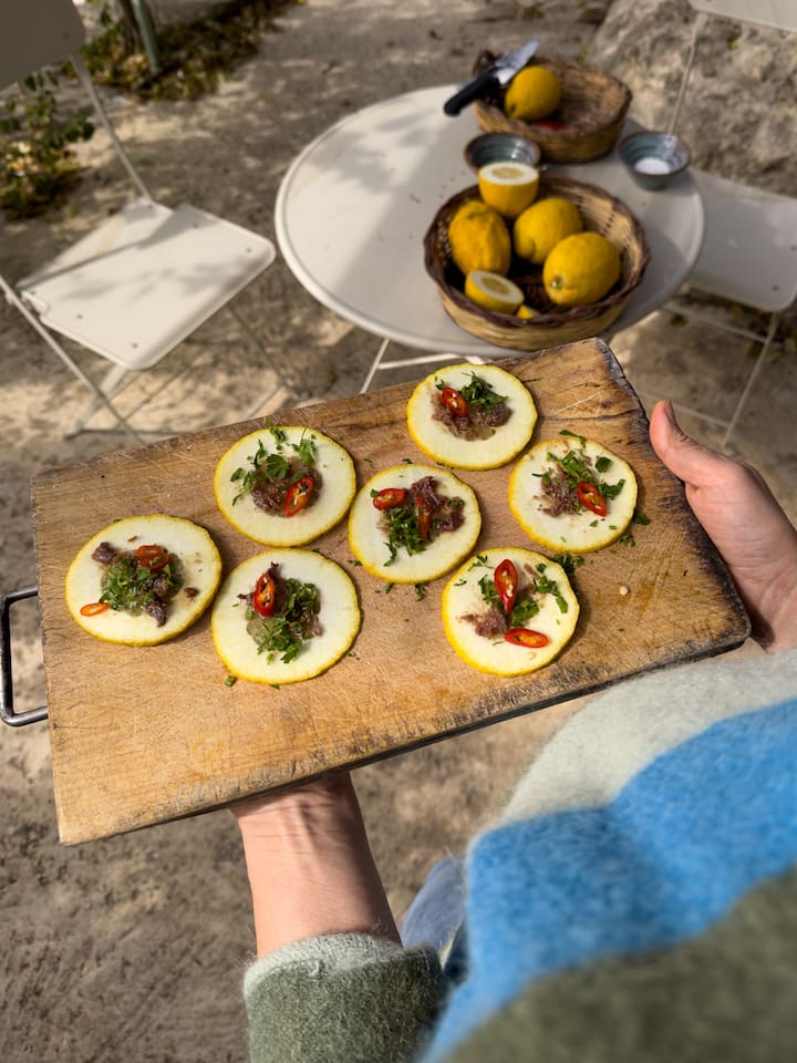 От години управлявам биологична ферма в Сицилия, където отглеждаме цитрусови плодове, авокадо и манго, следвайки устойчиви практики, които зачитат биологичното разнообразие. Аз се занимавам директно с управлението на овощните градини, отглеждането и събирането на реколтата. В кухнята приготвям традиционни сицилиански селски ястия, прости и сезонни, като използвам предимно продуктите на нашата компания и местни съставки.