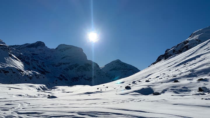 Фантастичен преход със снегоходки сред прекрасните върхове, които обграждат района на Юлиерпас, изследване на долини, алпийски проходи и замръзнали езера, в магията на заснежените планини.