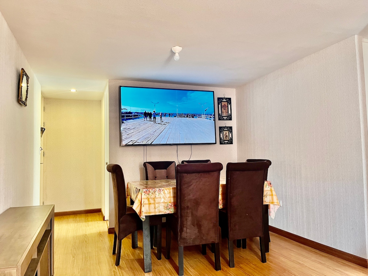 Апартамент, разположен в непосредствена близост до центъра на пристанището на МО, 3 - ти етаж в тиха ексклузивна урбанизация, пред посолството на Боливия, на 2 пресечки от площад Веа и пазара, Плаза де Армас, крайбрежна алея, плажове и търговски центрове. Препоръчва се за семейства, които искат да имат спокоен, приятен и безопасен престой. Разполага с всичко необходимо, като например да се чувствате като у дома си, телевизор 65"с кабелна телевизия FULL HD, 300 Mbps Wi - Fi, телевизор в 3 - те стаи с 32 ", 42" и 50 ". 100% СЕМЕЙСТВО.