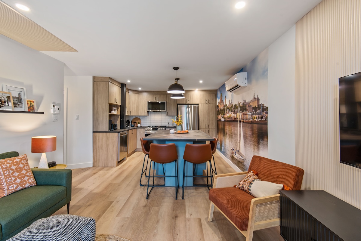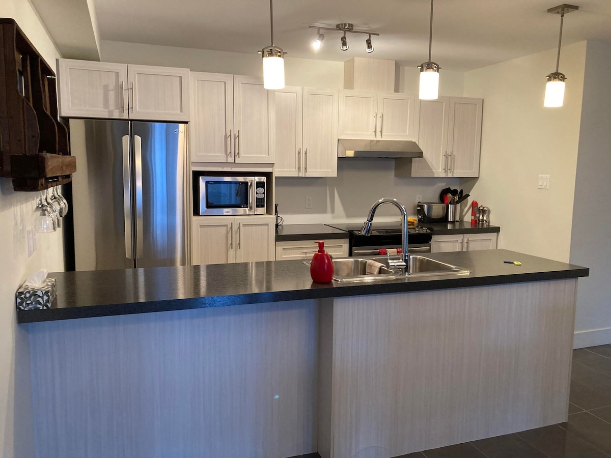 НОВО В AIRBNB. Климатик! Впечатляващ напълно оборудван апартамент с две спални пред Шато Фронтенак, на един хвърлей от ферибота до Квебек. Двуспални легла, първокласни спално бельо и матраци. Кафемашина Nespresso! Безплатен паркинг, напълно оборудвана кухня, пред (главната) улица „Bégin“. Чисто ново, топло и уютно място в сърцето на стария Леви. На 12 минути с ферибот от старото пристанище на Квебек. На 2-рия и последен етаж на сградата.