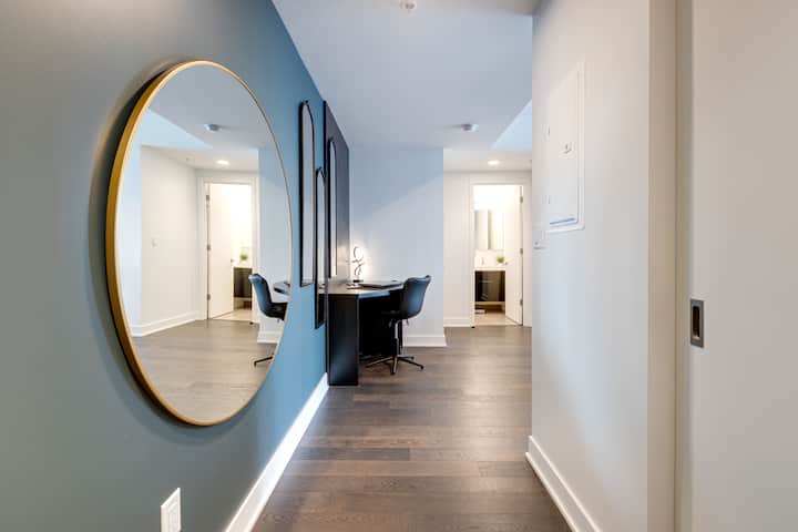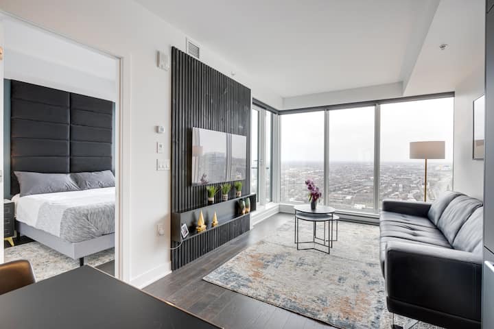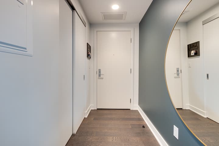 Разположен на последния етаж с широки градски гледки, нашият луксозен апартамент 1BR предлага стилно място за отдих в оживеното ядро на Монреал. Излезте на балкона за зашеметяваща гледка към хоризонта, оттеглете се в спокойната спалня, украсена със стенопис, вдъхновен от природата, и се насладете на уюта на всекидневната ни. Осигурете денонощно наблюдение и достъп до най - добрите забележителности на града. Отдайте се на място, където удобството среща елегантността за незабравим престой.