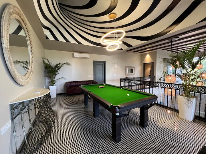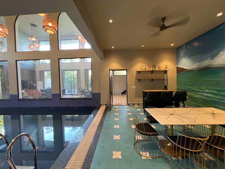 Добре дошли в Hangar 001, спокоен 500 кв. ярд. 3BHK Retreat, намиращо се на Airport Road, Siddharth Nagar, само на 500 метра от терминал 2 на летище Джайпур. Този имот е напълно оборудван с модерни удобства, включително Wi - Fi, плувен басейн, билярдна маса и балкон. Заобиколен от луксозен квартал със зашеметяваща гледка към летището, той предлага чист, чист въздух и буйна зелена обстановка. Резервирайте престоя си за спокойна и незабравима почивка!