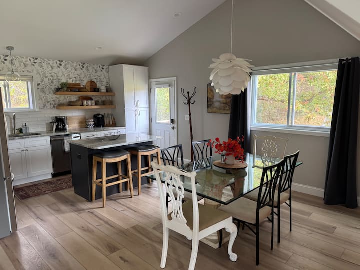 Деветнадесет (19) външни стълби ви отвеждат до частна къща за гости с 2 спални и 1 баня с открита дневна зона и напълно оборудвана кухня с бар остров. В банята има и пералня за ваше удобство. Отворена концепция за бар стол, кухня, всекидневна и трапезария за шестима. Голям прозорец от всекидневната гледа към спокойна ферма и околната река и планинската верига Фордж.