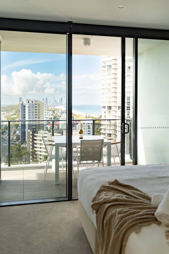 Апартаментът ни с две спални се гордее с панорамна гледка от цялата всекидневна и родителска спалня, улавяйки грандиозните залези над вътрешността и спиращата дъха брегова линия на Бърли Хедс, приканвайки океанския бриз да направи серенада на сетивата ви от самостоятелните ви балкони.