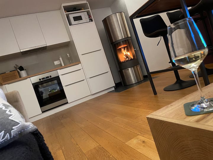 Когато се върнете в апартамента си, ще влезете в уютна всекидневна и трапезария с отворена кухня и всички мебели и материали, от които се нуждаете, за да се чувствате като у дома си. На ваше разположение са чайник, тостер, микровълнова печка и традиционна фурна, както и голям хладилник с вграден малък фризер и съдомиялна машина. Също така е и кафемашина Nespresso с 10 капсули за начало. Осигуряваме и основни подправки и подправки, както и олио и оцет. За традиционно планинско време, на ваше разположение са тенджера за фондю и раклетно устройство директно в апартамента, както и скара за маса, която да използвате вътре или на балкона в зависимост от сезона.