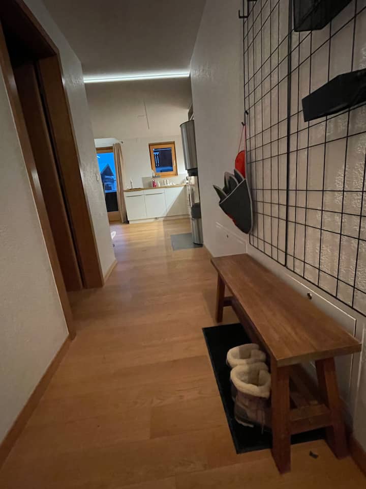 Напълно оборудвани и тихи 3,5 стаи на 2 - ри етаж, само на 5 минути пеша от паркинга/автогарата и центъра на селото. С автобусната спирка, разположена пред сградата, лесно ще стигнете до склоновете. До пистите има 1 ски гардероб за 4 чифта и обувки. Ще отседнете в уютна всекидневна с отворена кухня и трапезария, 2 спални, 1 баня и балкон, за да се насладите на приятелско или семейно време.
