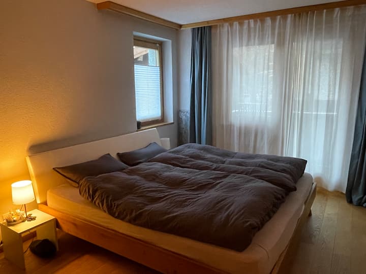 Апартаментът разполага с 2 спални с гардероби. Едната стая разполага с двойно легло king size (мек - среден матрак), а другата с размер Queen (матрак с твърд фотьойл). Този апартамент включва една баня и е подходящ за престой за 4 - ма души. Спално бельо и кърпи също са включени в наема. На разположение на всички гости на сградата на приземния етаж има пералня и сушилня срещу малка такса (1 CHF за пране / 2 CHF за сушене).