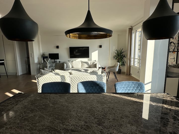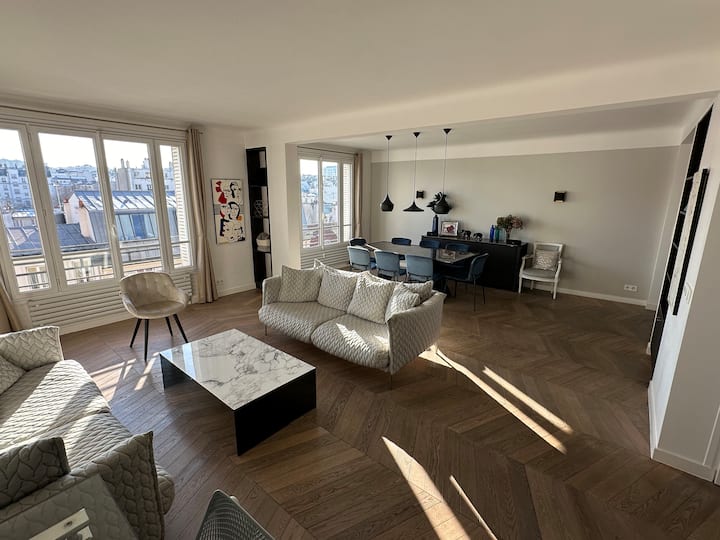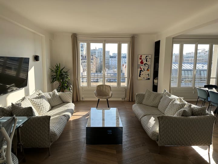 Разположен на шестия етаж, този апартамент с площ 100 кв. м е обърнат на ЮГ, облян в светлина и безпрепятствен. Тя ще ви даде безпрепятствен изглед към покривите на Париж.