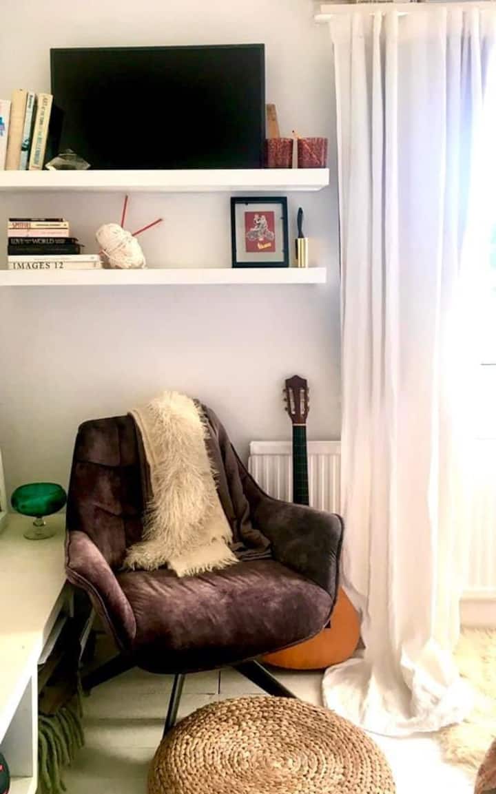 Светла стая, без използване на кухня, но МНОГО близо до страхотни кафенета/ресторанти/два супермаркета.