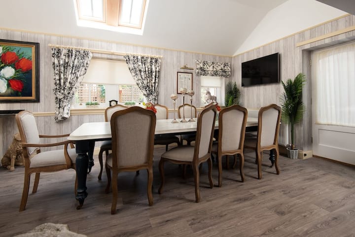 Отделна трапезария с маса за хранене, която разполага с шест места, но може да се разшири до 8 места.
