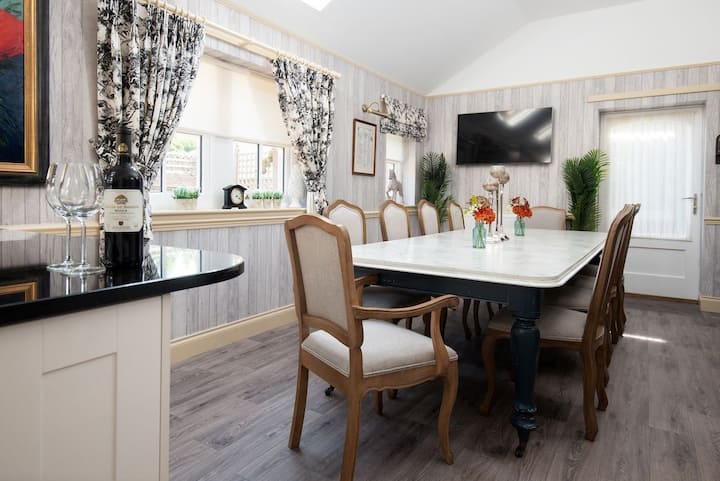 Кухня/трапезария с отворен план, напълно оборудвана с готварска печка с двойна фурна и скара, котлон с пет котлона, голям хладилник/фризер, съдомиялна машина, пералня/сушилня, микровълнова печка, кафемашина Nespresso (тип шушулка) и хладилник за вино. CD плейър/радио, монтиран на стената телевизор с плосък екран. Трапезария с голяма правоъгълна маса с мраморен плот за 10 - 12 гости. Имайте предвид, че масата за хранене е променена от кръглата, показана на текущите изображения.
