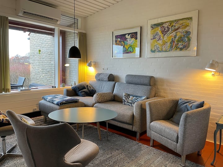 Ваканционният дом има уникално местоположение само на 90 метра от най - красивия плаж, подходящ за деца, а само на 5 минути пеша ще стигнете до очарователния център на Саби с магазини, през вълнообразния поток или можете да се разходите по другия път до пристанището, където ще намерите салони за сладолед, магазини и много яхти през лятото. Препоръчваме и разходка по течението в гората Себигард, където можете да се насладите на вълнообразната вода и голямата, красива букова гора. Намира се само на 10 минути пеша през красив по - стар жилищен район.