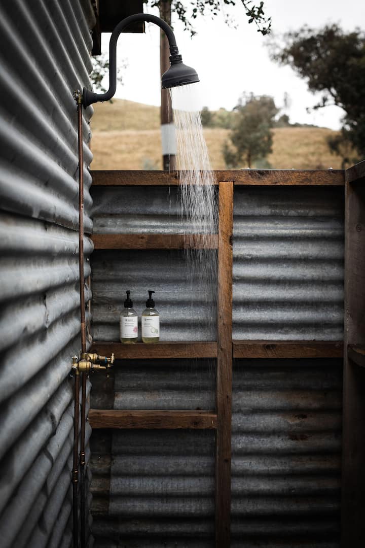 Sleeping arrangements are in four 5m bell tents that have 2 single beds in each tent. These are in the garden of the historic Rosewood Cottage. We provide a wool doona and 2 wool blankets plus a hot water bottle in colder weather. There is a lantern in each tent for lighting.