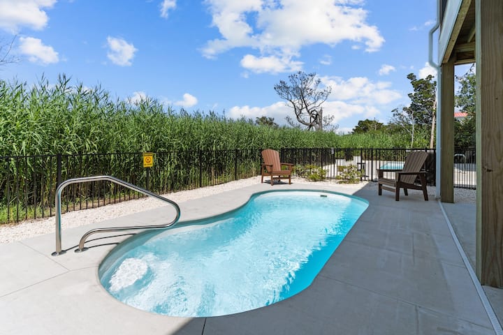 Самостоятелният басейн със солена вода от северната страна на къщата ще побере както любители на слънцето, така и на сянка. Насладете се на масата за пикник край басейна и кът за сядане под верандата. Зад ъгъла на басейна има затворен външен горещ/студен душ, който е удобен за душ или изплакване на пясъка. Газова скара се намира удобно близо до зоната за пикник на басейна.