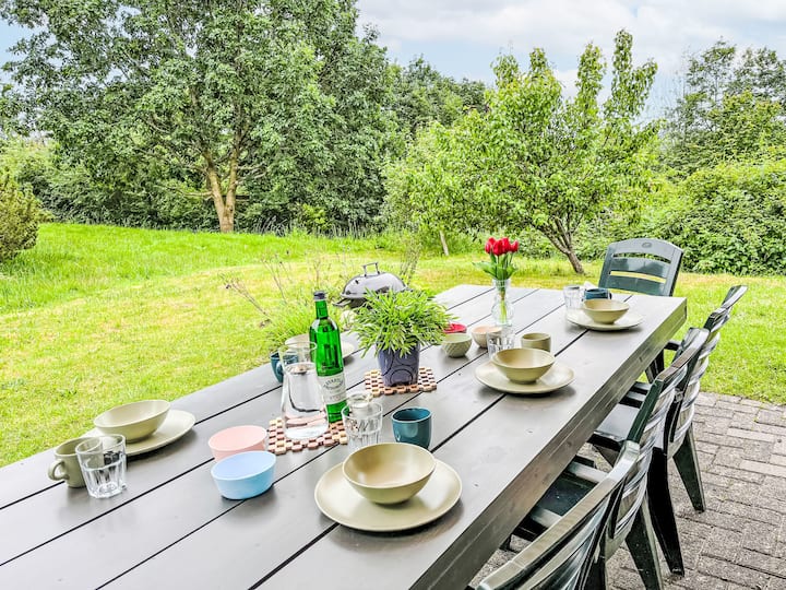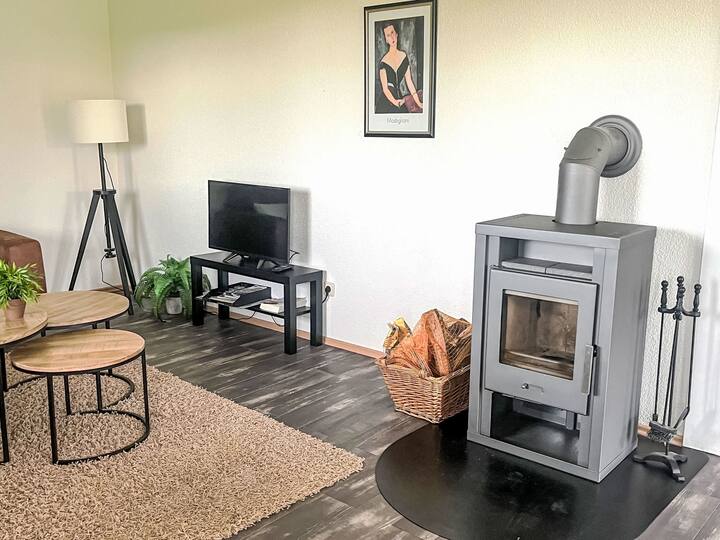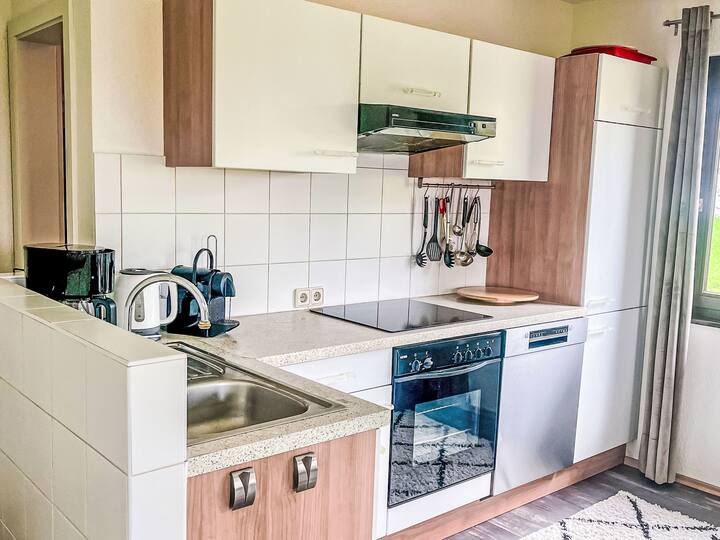 Горен етаж: всекидневна/трапезария със скандинавска печка на дърва. Излезте на балкона. 1 стая с наклонени тавани с 2 легла. 1 стая с наклонени тавани с 2 легла. Отворена кухня (фурна, съдомиялна машина, 4 керамични котлона, чайник, микровълнова печка, електрическа кафемашина). Душ/тоалетна. Електрическо отопление. Балкон, тераса, градина, морава. Мебели за тераса, балконски мебели, шезлонги (2). Красива гледка към провинцията. Удобства: мрежа против комари, детски стол за хранене, бебешко легло. Интернет (Wi - Fi, безплатно). Паркиране пред къщата. Моля, обърнете внимание: подходящо за семейства. Само за непушачи. Аларма за дим, пожарогасител. Няма вътрешна свързваща врата между етажите. И двата апартамента имат отделни входове.