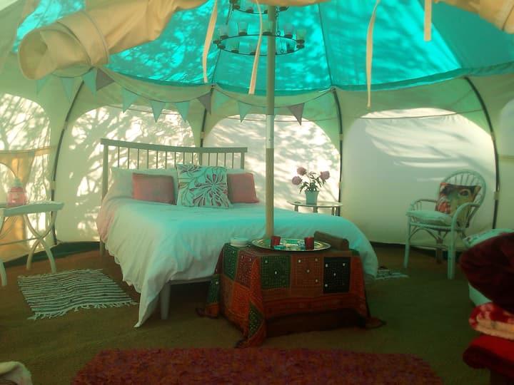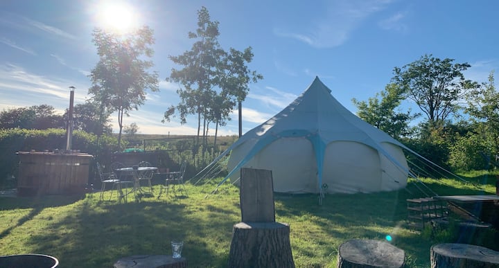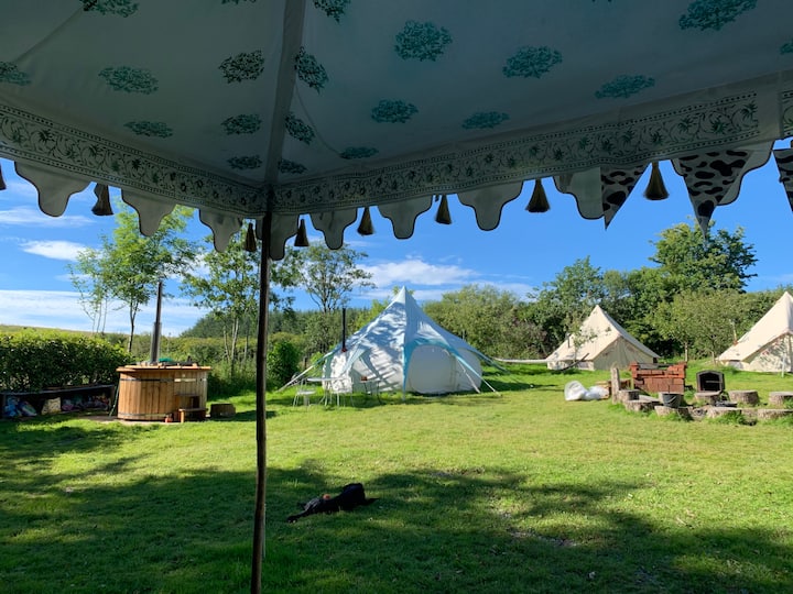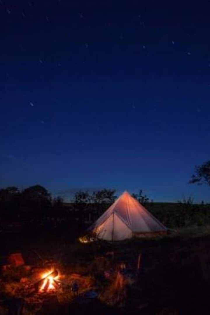 9 великолепни луксозни палатки тип „камбана“, всяка от които може да настани до 2 или 3 души. Подходящо за двойки, семейства или групи. Отдаваме под наем само за една резервация наведнъж, така че разполагате с цялото място само за себе си. Има огромна дървена хидромасажна вана, загрята от печка на дърва, която е идеалното място за гледане на звездите. Готвенето може да се извършва на газова готварска печка, над огнището, барбекю или фурна за пица.