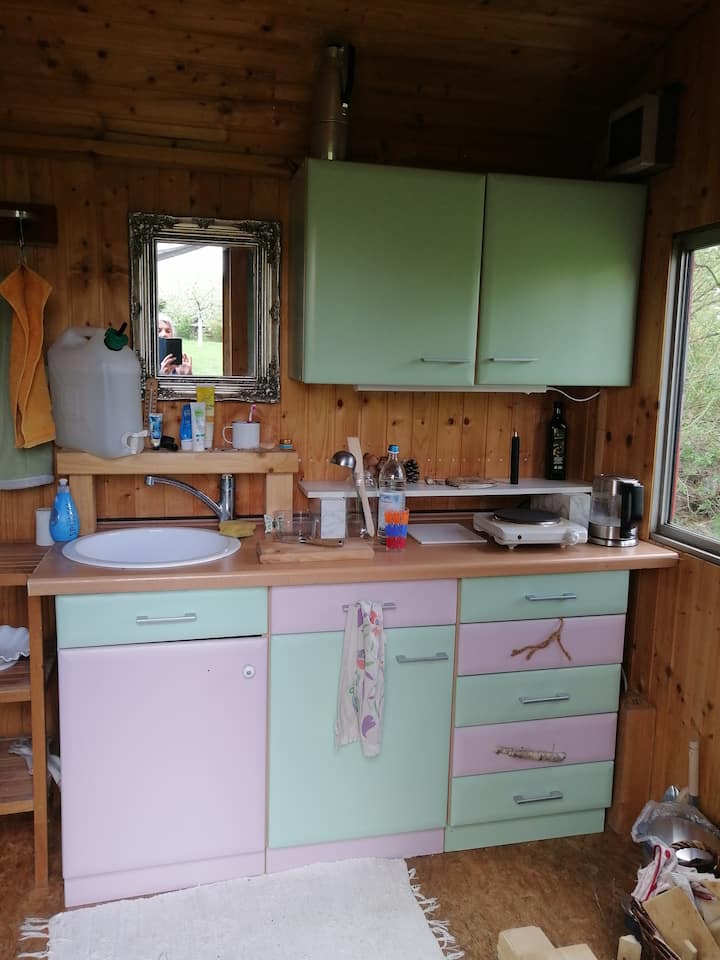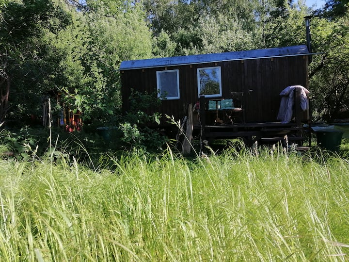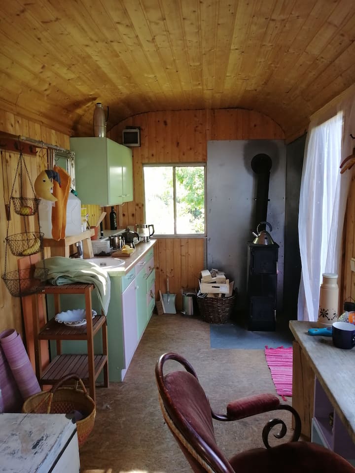 Строителен вагон с изглед към овощна градина