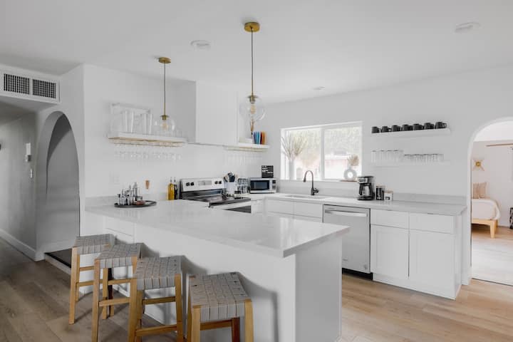 Кухнята осигурява всичко необходимо за обикновени ястия у дома, с място за приготвяне на ястия и наслаждаване на тях на закрито или навън, когато времето позволява. Трапезната маса и кафемашината подпомагат лесните ежедневни процедури, независимо дали започвате сутринта тихо, или се отпускате след ден навън в Скотсдейл.