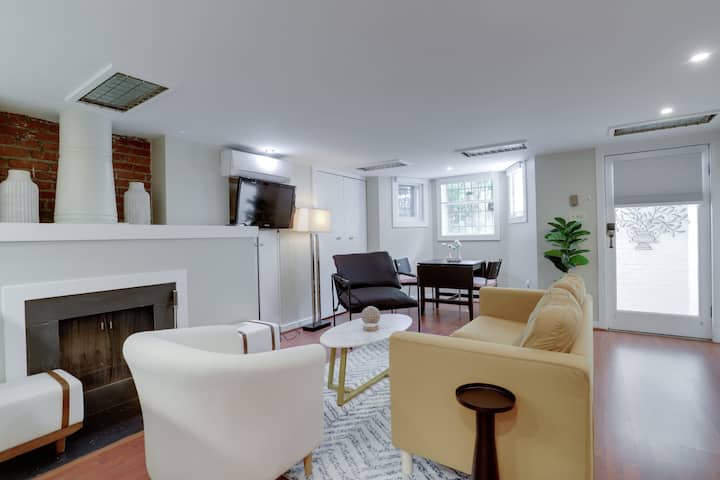 Този дом в Капитолийския хълм е сутерен с 1 спалня, който предлага комбинация от исторически щрихи с модерно удобство и е внимателно проектиран за дългосрочни престои. Всекидневната е удобна и привлекателна, с вградено осветление и достатъчно място за удобни места за сядане, идеални за отдих.