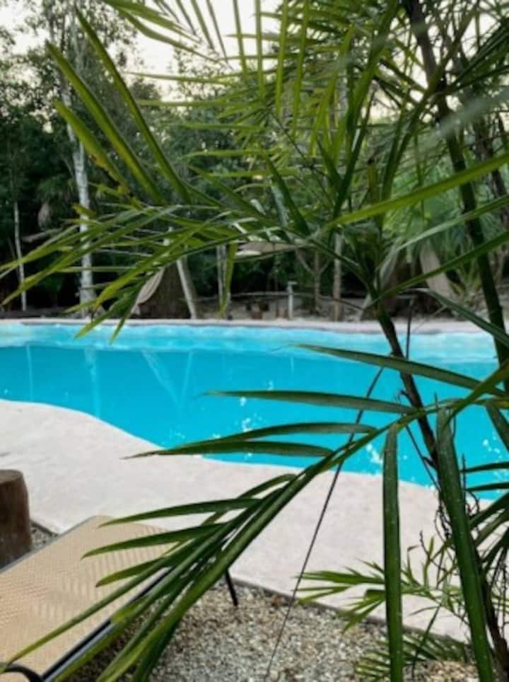 Еко хотел. Пуерто Морелос, Q.Roo Mexico. Към Леона Викарио, на 20 минути от плажа на 40 минути от летище Канкун на 50 минути от Плая дел Кармен, хотел за почивка, прекъсване на технологиите и града , прекрасно изживяване с природата , наблюдение на птици и почивка във водите на басейна, ресторант, отворен за 3 хранения . Бицис , петанк, билярд, салон с хамаци и други удобства, на които да се насладите като семейство или като двойка.