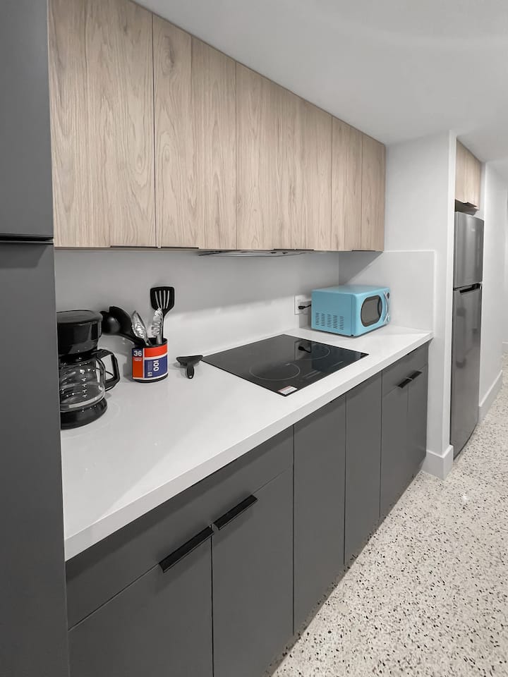 В КУХНЯТА има всичко необходимо, ако решите да готвите; няма прозорец, използвайте аспиратор