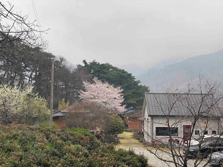 Къща за гости в стил ханок, управлявана от Самжин дауон, с изглед към река Самжин и планината Джирисан