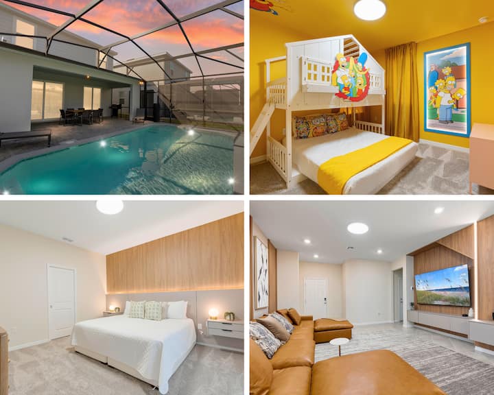 Тази луксозна вила в курорта Windsor Cay е идеална за семейства или групи, предлагайки 5 спални, 5 бани и места за настаняване за до 13 гости. На първия етаж ще намерите удобен апартамент с голямо двойно легло, идеален за гости, които предпочитат лесен достъп. На горния етаж вилата разполага с просторна спалня с голямо двойно легло, апартамент с две единични легла, апартамент с двуетажно легло с тематика „Семейство Симпсън“ и апартамент с две двойни легла с тематика „Хари Потър“, осигуряващи забавление и комфорт за всички възрасти. За да завършат изживяването, гостите могат да се насладят на самостоятелен басейн и стая за игри с тематика „Марио“, което прави този дом перфектна комбинация от релаксация и забавление.