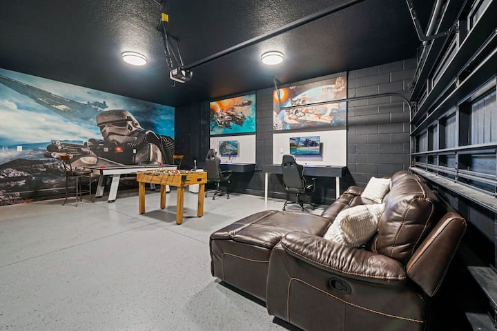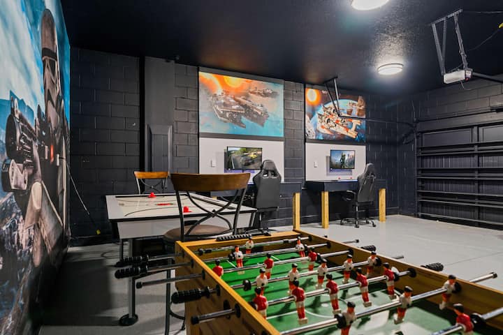 Излезте навън през просторните стъклени плъзгащи се врати към личния си оазис. Покритата тераса на басейна и хидромасажната вана са идеални за почивка след ден в парковете, а басейнът дори може да се отоплява срещу допълнително заплащане. За забавление вилата разполага с фантастична стая за игри, оборудвана с джаги, ретро аркадни игри, Xbox и поддръжка на хокей на въздух, които всички се забавляват с часове.