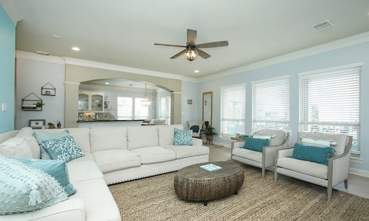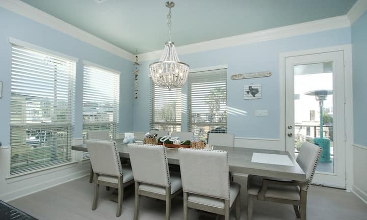 Този луксозен дом разполага с 4 спални, 3 бани, специален офис, игрална зала и просторна горна тераса с панорамен изглед към водата. Само на минути от най - добрите атракции на крайбрежието на Тексас в Персийския залив като Kemah Boardwalk, NASA Space Center, Moody Gardens и Galveston Beaches.