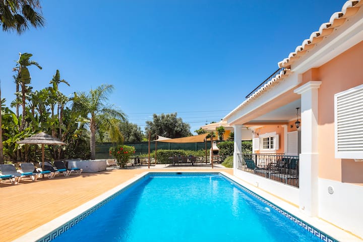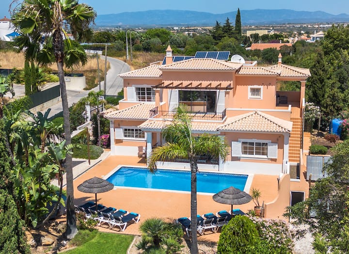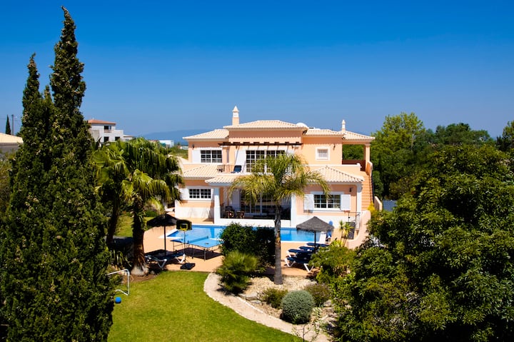 Удивителна вила с 5 спални с баня, за 2 – 10 души. Перфектно за семейства, с оградена тераса с изглед към голям басейн 10 х 5 м. Насладете се на собствена бар зона с допълнителен хладилник и по желание 30 л/50 л бъчви с бира. Включва специална детска зона за игра, тенис на маса, Wi-Fi и над 100 телевизионни канала. Разположен в зашеметяващи озеленени градини в Карвоейро, Лагоа. Без такси за почистване! Отоплението на басейна и хидромасажната вана са на разположение като допълнителни екстри, за да персонализирате престоя си.