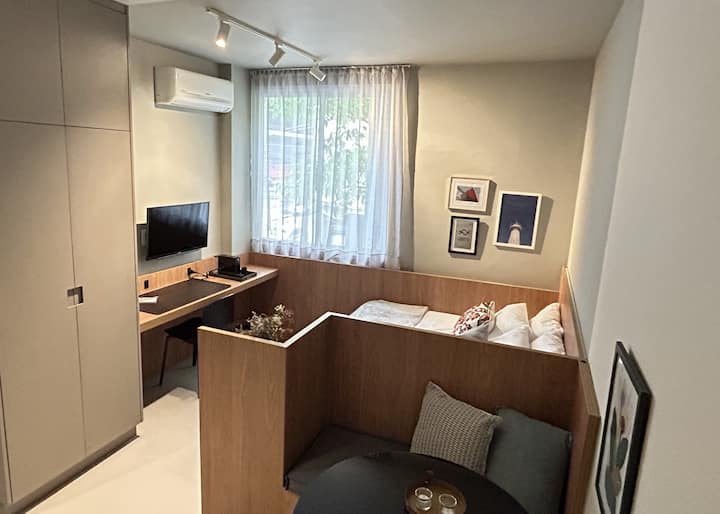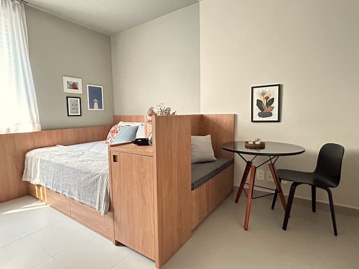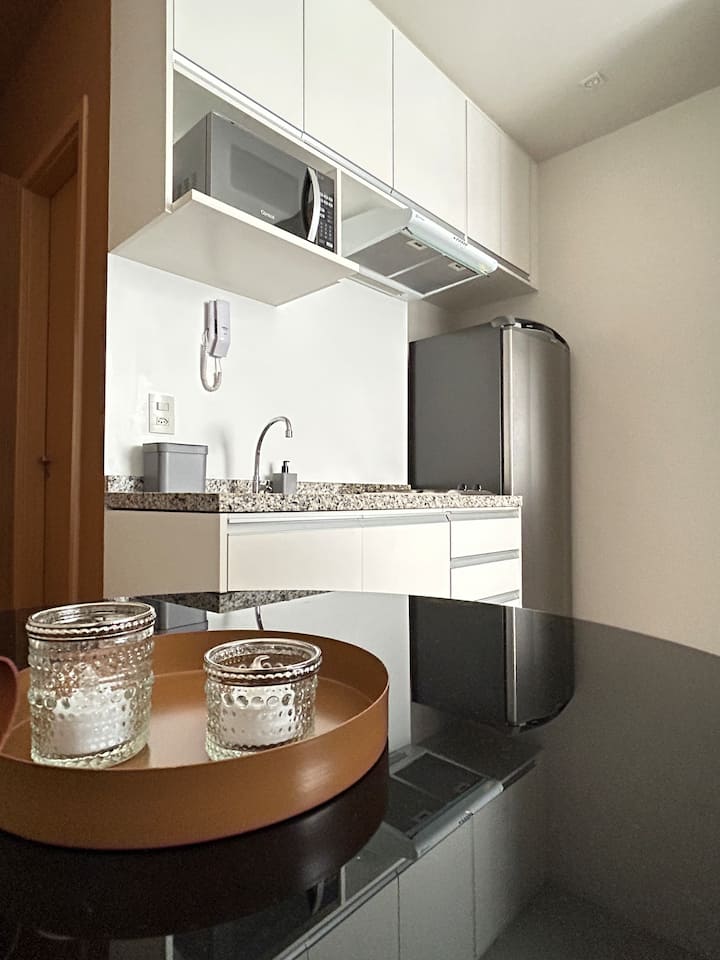 Студиото е планирано да осигури комфорт, функционалност и топлина по време на престоя ви. Наскоро декориран и оборудван имот. Разполага с Wi - Fi, климатик, смарт телевизор, венециански митър, дистанционно работно пространство, индиректно осветление и напълно оборудвана кухня. Намира се в оживен регион на столицата Сао Пауло. Центърът на Сао Пауло се е превърнал в културен, гастрономически, творчески и забавен център. Метро Република (400 м) – автобусно обслужване до летище Република (450 м) – КОПАН (350 м)
