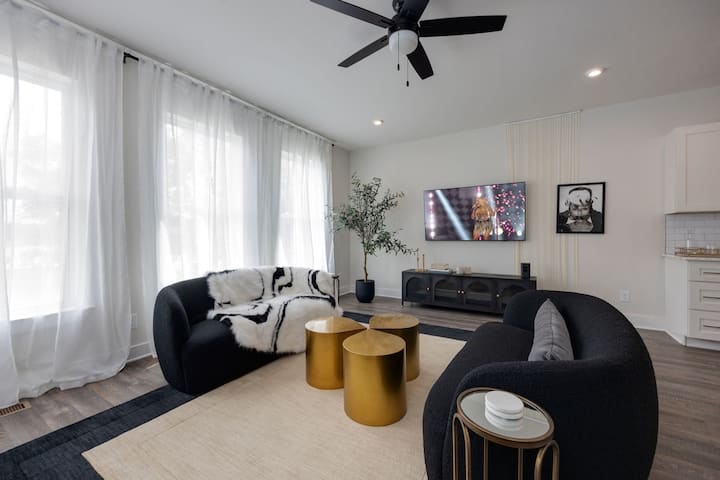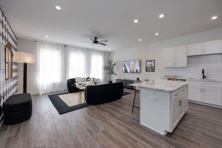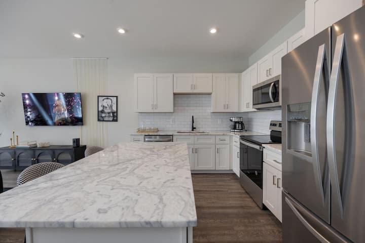 Основната всекидневна заема целия втори етаж и представлява отворено пространство, което безпроблемно съчетава стил и комфорт. Слънчевата светлина наводнява стаята през големи прозорци, осветява дизайнерското обзавеждане и създава привлекателна атмосфера. Всекидневната, с плюшени места за сядане и смарт телевизор, служи като идеалното място за отдих след ден, прекаран в разглеждане на Нашвил. Само на няколко крачки от вас ви очаква безупречно проектираната кухня - мечтата на артиста с първокласни уреди от неръждаема стомана, просторни изцяло бели шкафове и елегантни плотове. Големият остров, оборудван с бар кът за сядане, е идеален за всичко - от гурме вечери до ежедневни закуски или прясно приготвена чаша кафе. Всеки детайл е внимателно подбран, за да се създаде пространство, което е толкова елегантно, колкото и приветливо, което го прави истинското сърце на престоя ви.