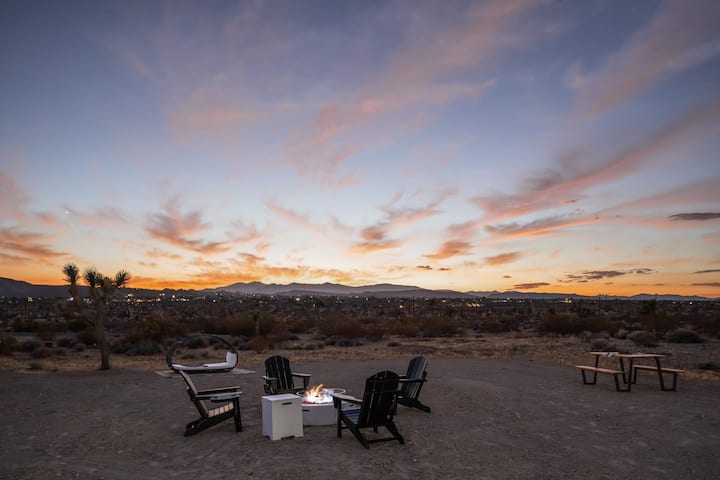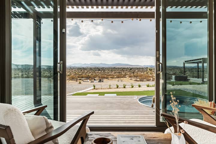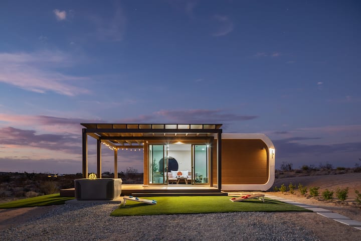 Изработена от устойчиви материали и разположена на девствена земя с планински гледки, собствеността предлага две самостоятелни капсули. Резервирайте едно студио или добавете второто студио за по-големи групи! Всяко студио с площ от 32 кв. м разполага с напълно оборудвана кухня, големи прозорци с изглед към пустинята и частни удобства на открито, като хидромасажна вана, каубойски басейн и спокойни вътрешни дворове. Добре дошли в 3D в JT!