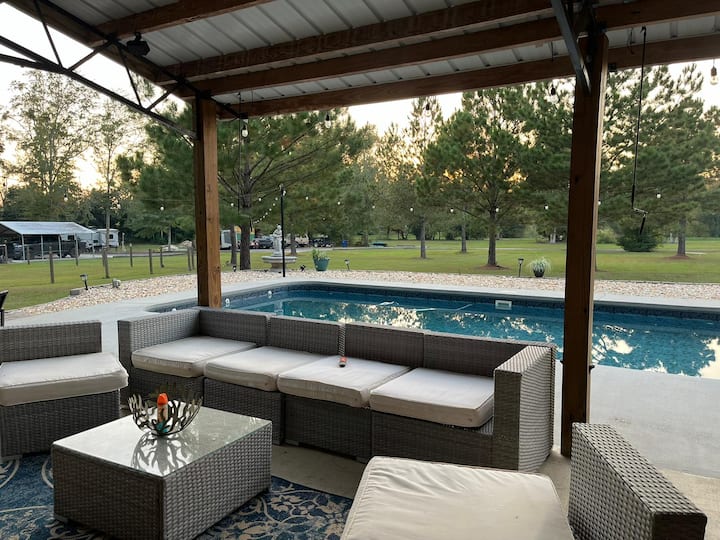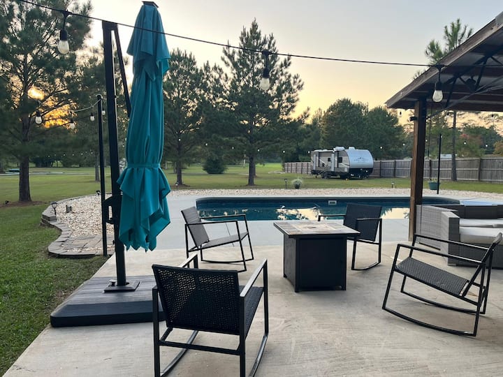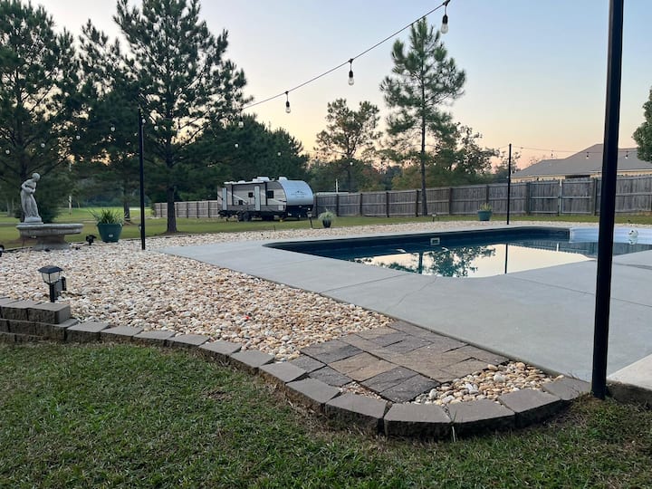 Каравана с басейн и изглед към природата