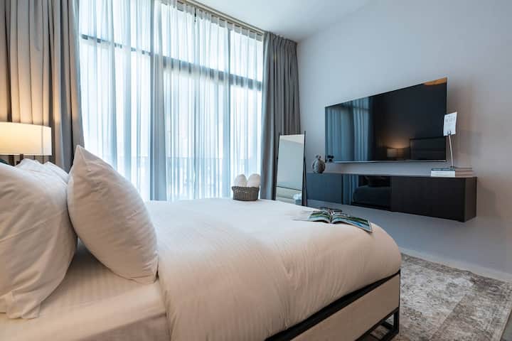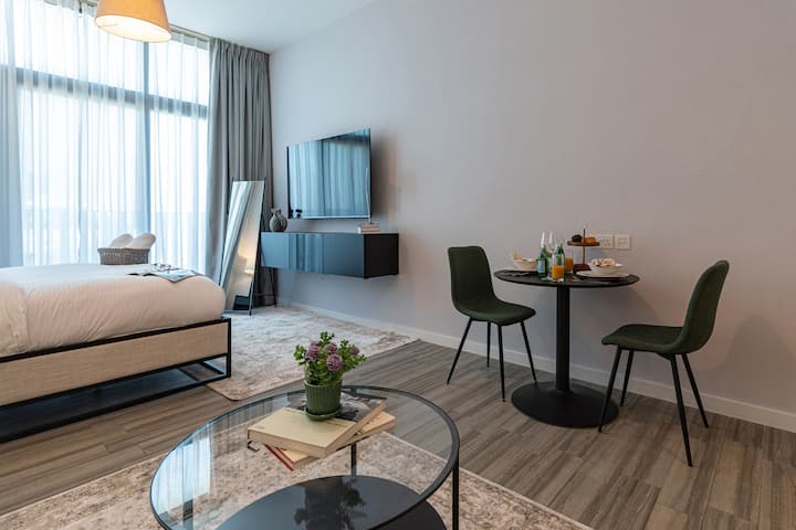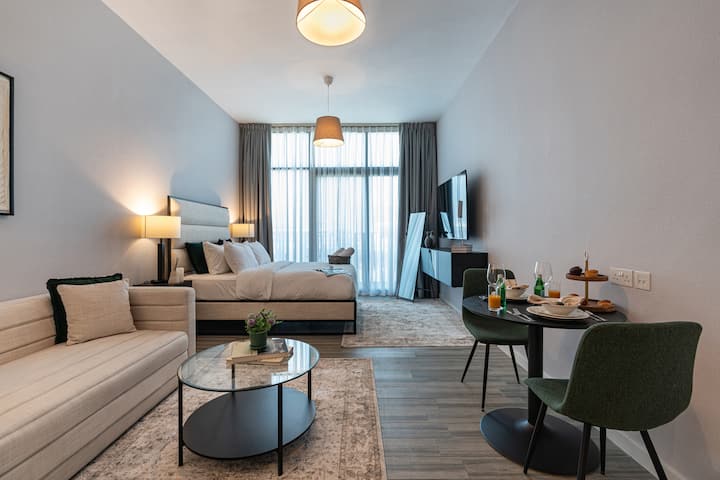 Добре дошли в моя стилен и просторен студио апартамент в Белгравия 2, Jumeirah Village Circle (JVC)! Добре проектираното студио разполага с уютна двуместна трапезария, удобно двойно легло, голям диван за отдих и модерен 50 - инчов 4K телевизор.