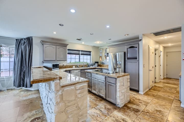 Добре дошли във вашето луксозно място за отдих! Това зашеметяващо светилище с 5 спални предлага всичко необходимо за незабравима почивка. Потопете се в искрящия неотопляем басейн, докато се наслаждавате на слънцето във Вегас. Запалете скарата за барбекю за хранене на открито в красиво озеленения оазис в задния двор.