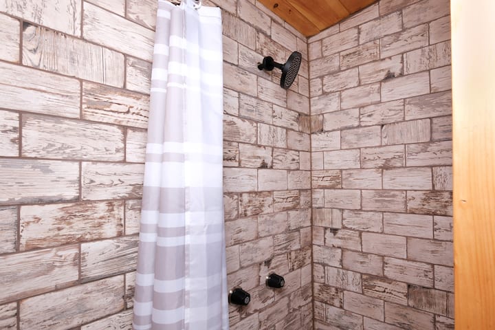 Банята в хижата разполага с душ, наподобяващ спа, с дъждова душ глава и плочки, стилизирани като дърво от рустикален хамбар.